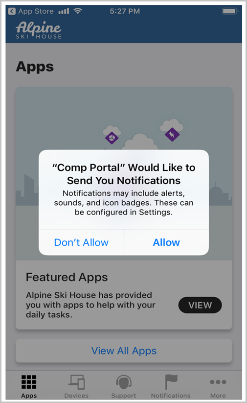 When prompted to receive Company Portal notifications, tap Allow. Company Portal uses notifications to alert you if, for example, your device settings need to be updated.