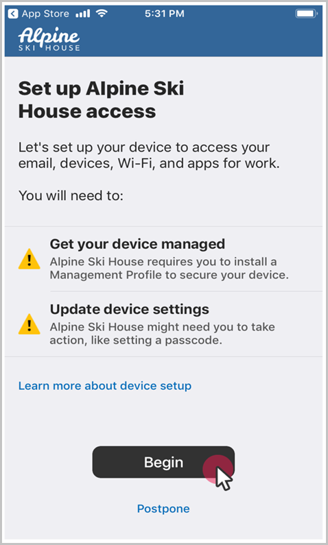 Pausing for more than a few minutes during enrollment might cause the app to close or end setup. If this happens, open the Company Portal app and try again.