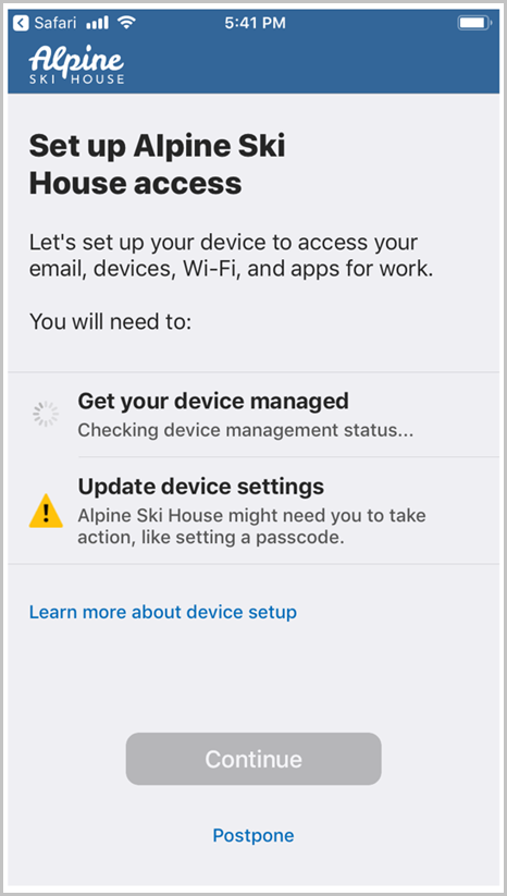 Company Portal will begin to sync and set up your device. Company Portal might prompt you to update additional device settings. If it does, tap Continue.